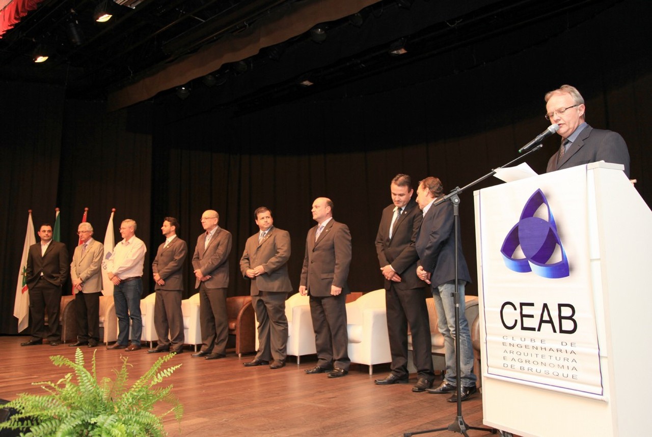 “É uma grande satisfação estar em Brusque nesta data para prestigiar a abertura da Semana de Engenharia e o lançamento do livro que resgata a memória urbana de Brusque e a história do CEAB, uma das entidades mais fortes e atuantes do Estado”, destacou o presidente do CREA/SC, Engº Civil e de Segurança, Carlos Alberto “Kita” Xavier. Ele fez ainda uma saudação especial ao engenheiro brusquense João de Oliveira, que nas suas duas gestões integra a Diretoria do CREA/SC e falou da importância das obras de infraestrutura -temas que fazem parte das palestras da Semana de Engenharia - para o desenvolvimento das cidades, citando como exemplo as obras de duplicação da Rodovia Antônio Heil, aguardadas há tantos anos pelas comunidades da região. Agradeceu a oportunidade do Conselho Regional participar do Livro do CEAB e desejou sucesso a todos os participantes da Semana de Engenharia.
