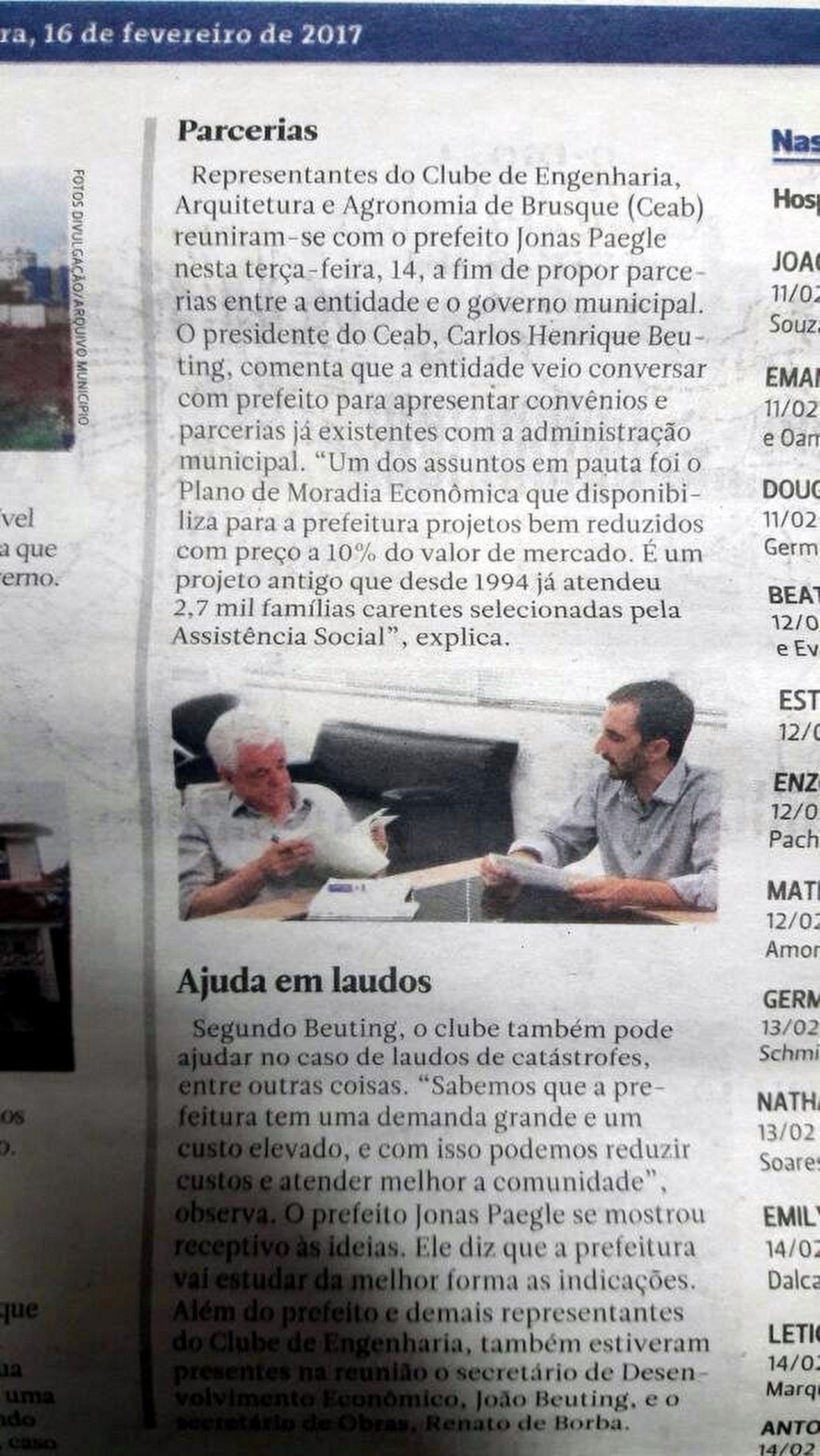 Além do presidente do CEAB Carlos Henrique Beuting e do prefeito Jonas Paegle, participaram da reunião, pelo CEAB: o Vice-presidente Anderson Buss, o Diretor Moradia Econômica Murilo Cecconello, o Coordenador do Núcleo Civil Braulio Rodrigues Rocha e pela Prefeitura Municipal: Secretário de Desenvolvimento Econômico João Beuting e o Secretário de Obras Renato de Borba.