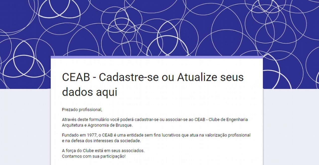 Desenvolvemos um formulário onde você poderá cadastrar-se ou associar-se ao CEAB - Clube de Engenharia Arquitetura e Agronomia de Brusque, pode ser acessado no link abaixo:
